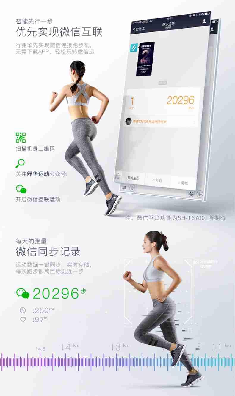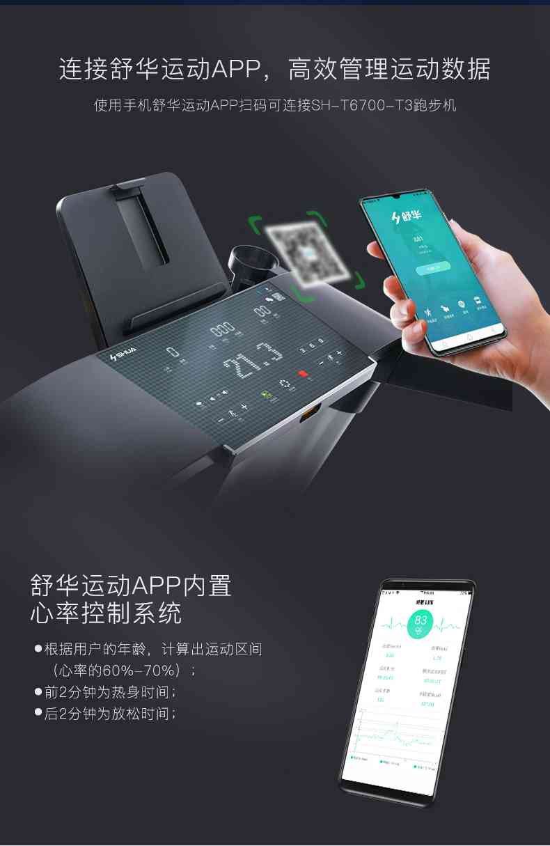 SH-T6700-T3跑步机为了帮助用户进行更加科学有效的运动,搭载星空xkAPP连接心率臂带实现心率控制,通过监测运动心率从而实现科学运动。