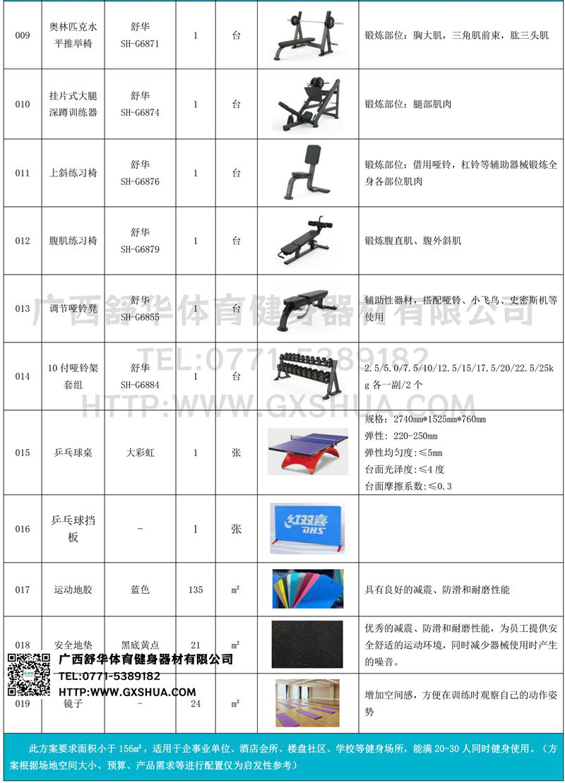 史密斯机(1台)、深蹲架1台)、水平推举椅1台)、多重可调节练习椅(1台)、腹肌训练器(1台)、罗马椅(1台)、上斜练习椅(1台)、10付哑铃套组(1套)、可调哑铃凳(1张)-可以实现对不同肌肉群的针对性训练,满足肌肉训练需求,全方位激活身体机能。