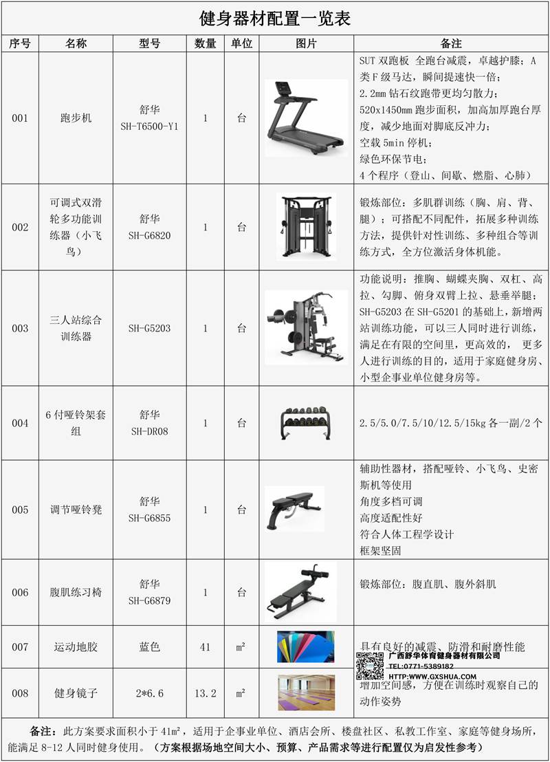 此方案要求面积小于41m²,适用于企事业单位、酒店会所、楼盘社区、私教工作室、家庭等健身场所,能满足8-12人同时健身使用(方案根据场地空间大小、预算、产品需求等进行配置仅为启发性参考)