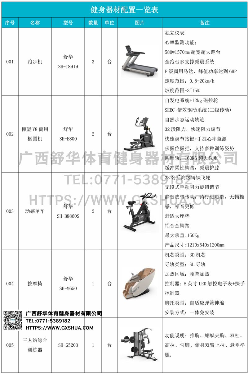 1.星空xkV9跑步机SH-T8919*3台-F级商用马达-超强马达,AC 3.0HP 交流,峰值功率达到6HP,F级商用品质。速度范围达到0.8-20km/h;V9跑步机可实现跑台扬升功能,坡度范围-3~15%,满足客户不同的锻炼需求。