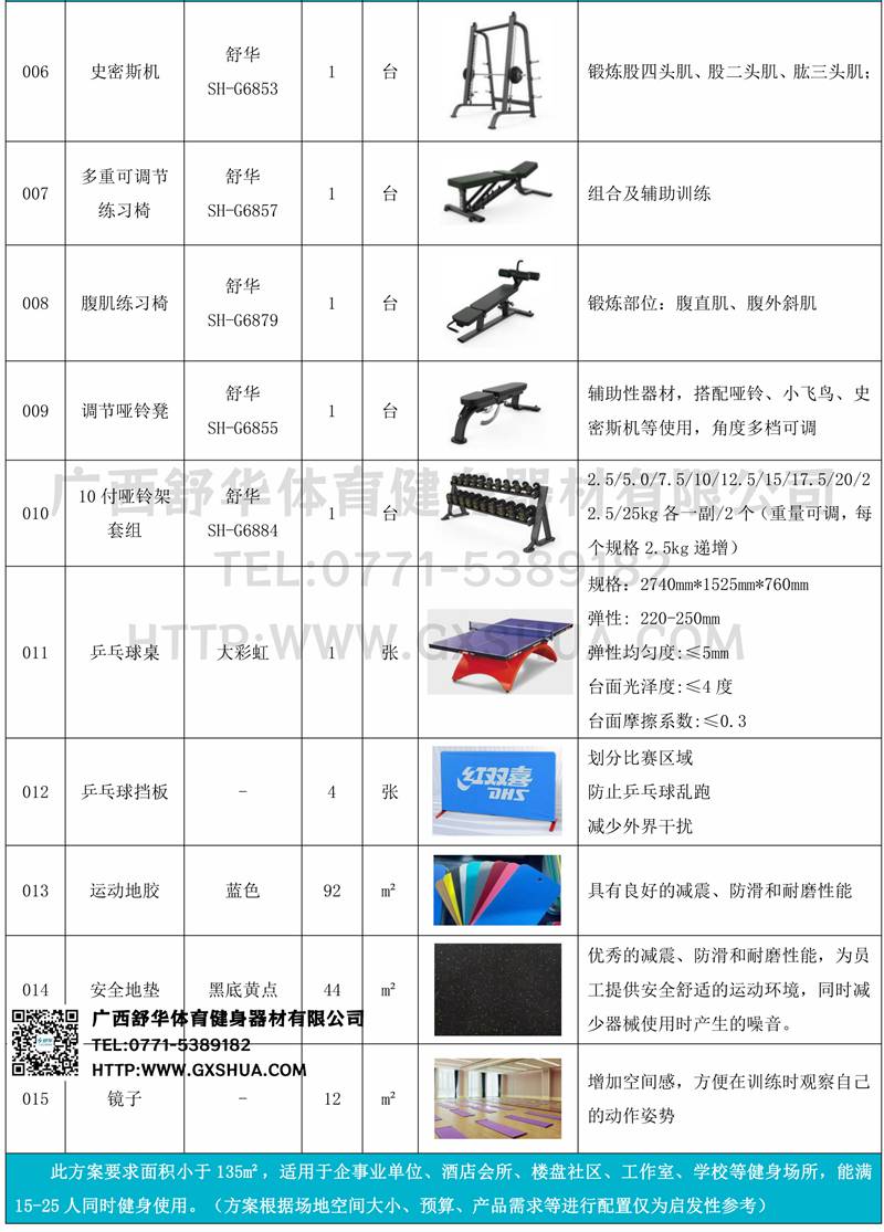 此方案要求面积小于135m²,适用于企事业单位、酒店会所、楼盘社区、工作室、学校等健身场所,能满15-25人同时健身使用。(方案根据场地空间大小、预算、产品需求等进行配置仅为启发性参考)