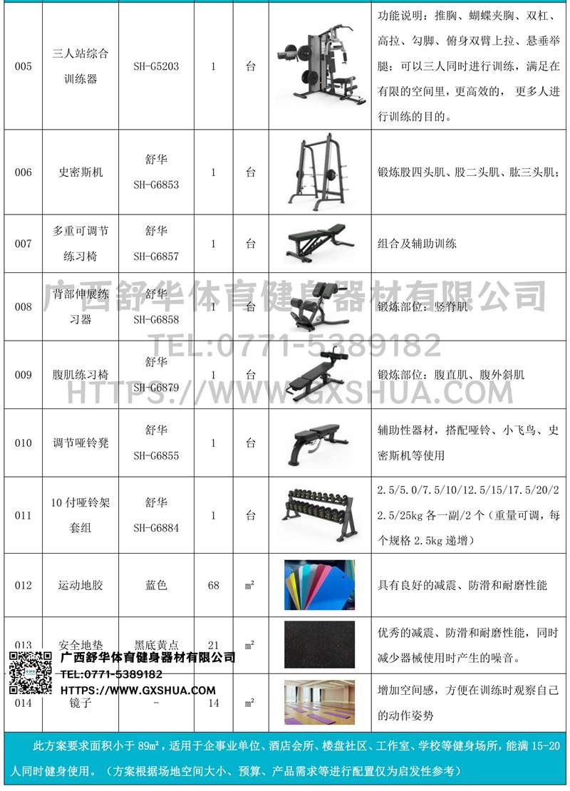 此方案要求面积小于89m²,适用于企事业单位、酒店会所、楼盘社区、工作室、学校等健身场所,能满15-20人同时健身使用。(方案根据场地空间大小、预算、产品需求等进行配置仅为启发性参考)